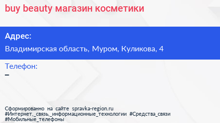 buy beauty, магазин косметики по адресу Владимирская область, Муром, Куликова, 4 в дальнейшем Организация, размещена в следующих категориях: