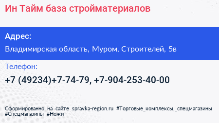 Ин Тайм, база стройматериалов по адресу Владимирская область, Муром, Строителей, 5в в дальнейшем Организация, размещена в следующих категориях: