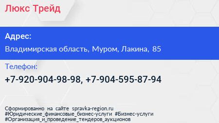 Люкс Трейд по адресу Владимирская область, Муром, Лакина, 85 в дальнейшем Организация, размещена в следующих категориях: