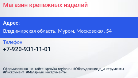 Магазин крепежных изделий по адресу Владимирская область, Муром, Московская, 54 в дальнейшем Организация, размещена в следующих категориях: