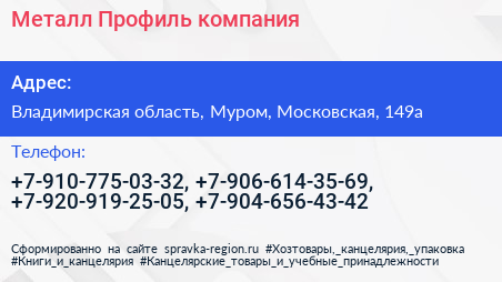 Металл Профиль, компания по адресу Владимирская область, Муром, Московская, 149а в дальнейшем Организация, размещена в следующих категориях: