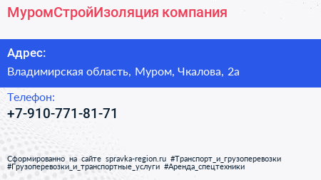 МуромСтройИзоляция, компания по адресу Владимирская область, Муром, Чкалова, 2а в дальнейшем Организация, размещена в следующих категориях: