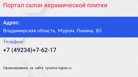 Портал, салон керамической плитки по адресу Владимирская область, Муром, Лакина, 85 в дальнейшем Организация, размещена в следующих категориях: