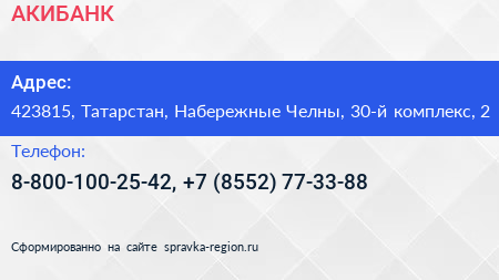АКИБАНК по адресу 423815, Татарстан, Набережные Челны, 30-й комплекс, 2 в дальнейшем Организация, размещена в следующих категориях: