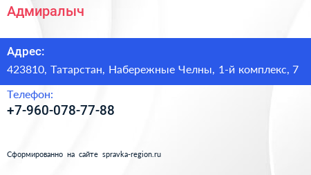 Адмиралыч по адресу 423810, Татарстан, Набережные Челны, 1-й комплекс, 7 в дальнейшем Организация, размещена в следующих категориях: