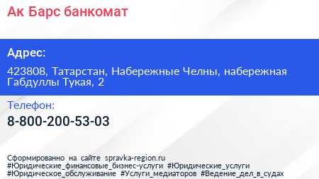 Ак Барс, банкомат по адресу 423808, Татарстан, Набережные Челны, набережная Габдуллы Тукая, 2 в дальнейшем Организация, размещена в следующих категориях: