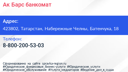 Ак Барс, банкомат по адресу 423802, Татарстан, Набережные Челны, Батенчука, 18 в дальнейшем Организация, размещена в следующих категориях: