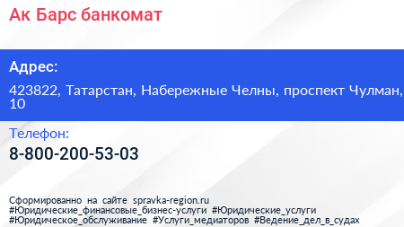 Ак Барс, банкомат по адресу 423822, Татарстан, Набережные Челны, проспект Чулман, 10 в дальнейшем Организация, размещена в следующих категориях: