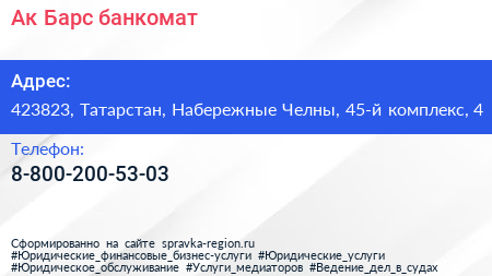 Ак Барс, банкомат по адресу 423823, Татарстан, Набережные Челны, 45-й комплекс, 4 в дальнейшем Организация, размещена в следующих категориях: