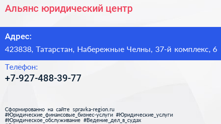 Альянс, юридический центр по адресу 423838, Татарстан, Набережные Челны, 37-й комплекс, 6 в дальнейшем Организация, размещена в следующих категориях: