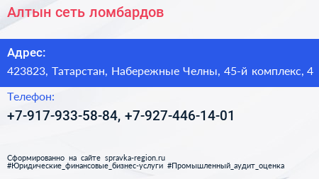 Алтын, сеть ломбардов по адресу 423823, Татарстан, Набережные Челны, 45-й комплекс, 4 в дальнейшем Организация, размещена в следующих категориях:
