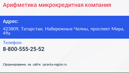Арифметика, микрокредитная компания по адресу 423809, Татарстан, Набережные Челны, проспект Мира, 49а в дальнейшем Организация, размещена в следующих категориях:
