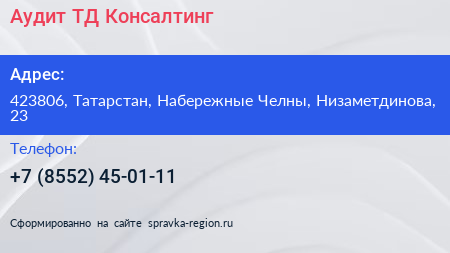 Аудит ТД-Консалтинг по адресу 423806, Татарстан, Набережные Челны, Низаметдинова, 23 в дальнейшем Организация, размещена в следующих категориях: