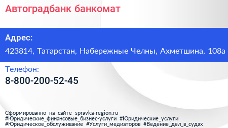 Автоградбанк, банкомат по адресу 423814, Татарстан, Набережные Челны, Ахметшина, 108а в дальнейшем Организация, размещена в следующих категориях: