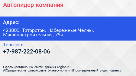 Автолидер, компания по адресу 423800, Татарстан, Набережные Челны, Машиностроительная, 75а в дальнейшем Организация, размещена в следующих категориях: