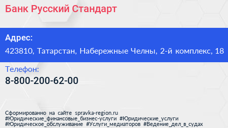 Банк Русский Стандарт по адресу 423810, Татарстан, Набережные Челны, 2-й комплекс, 18 в дальнейшем Организация, размещена в следующих категориях: