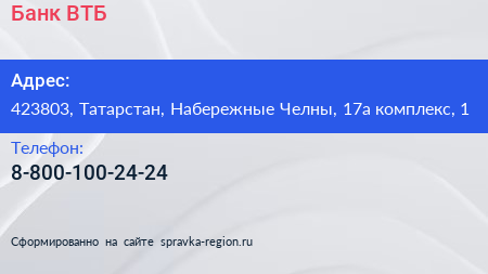 Банк ВТБ по адресу 423803, Татарстан, Набережные Челны, 17а комплекс, 1 в дальнейшем Организация, размещена в следующих категориях: