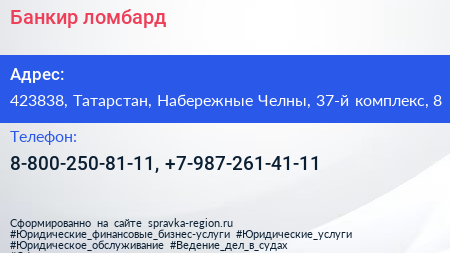 Банкир, ломбард по адресу 423838, Татарстан, Набережные Челны, 37-й комплекс, 8 в дальнейшем Организация, размещена в следующих категориях: