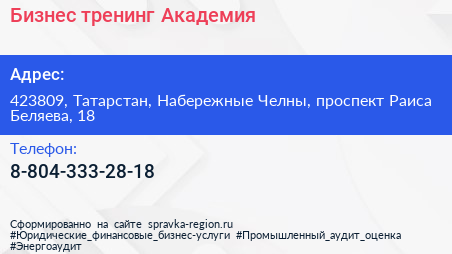 Бизнес-тренинг Академия по адресу 423809, Татарстан, Набережные Челны, проспект Раиса Беляева, 18 в дальнейшем Организация, размещена в следующих категориях: