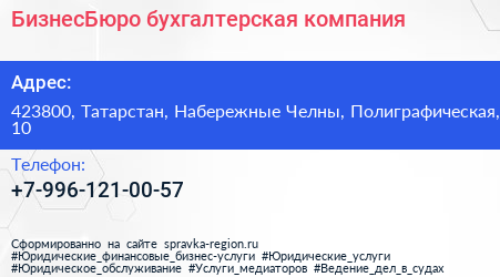 БизнесБюро, бухгалтерская компания по адресу 423800, Татарстан, Набережные Челны, Полиграфическая, 10 в дальнейшем Организация, размещена в следующих категориях: