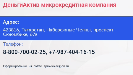 ДеньгиАктив, микрокредитная компания по адресу 423816, Татарстан, Набережные Челны, проспект Сююмбике, 67в в дальнейшем Организация, размещена в следующих категориях: