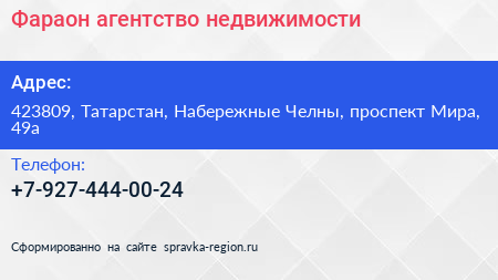 Фараон, агентство недвижимости по адресу 423809, Татарстан, Набережные Челны, проспект Мира, 49а в дальнейшем Организация, размещена в следующих категориях: