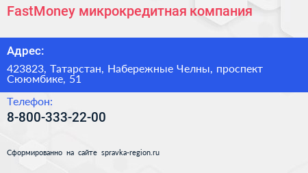 FastMoney, микрокредитная компания по адресу 423823, Татарстан, Набережные Челны, проспект Сююмбике, 51 в дальнейшем Организация, размещена в следующих категориях: