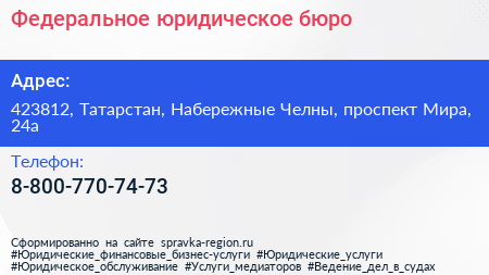 Федеральное юридическое бюро по адресу 423812, Татарстан, Набережные Челны, проспект Мира, 24а в дальнейшем Организация, размещена в следующих категориях: