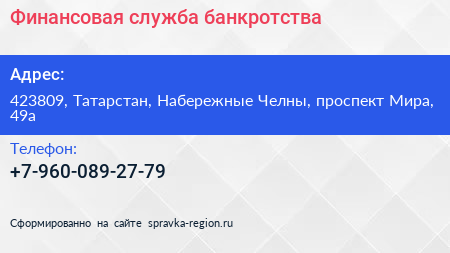 Финансовая служба банкротства по адресу 423809, Татарстан, Набережные Челны, проспект Мира, 49а в дальнейшем Организация, размещена в следующих категориях: