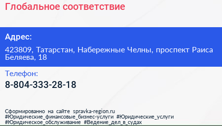 Глобальное соответствие по адресу 423809, Татарстан, Набережные Челны, проспект Раиса Беляева, 18 в дальнейшем Организация, размещена в следующих категориях: