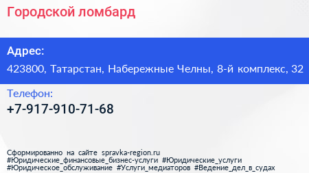 Городской ломбард по адресу 423800, Татарстан, Набережные Челны, 8-й комплекс, 32 в дальнейшем Организация, размещена в следующих категориях: