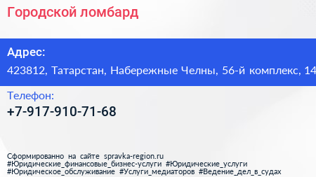Городской ломбард по адресу 423812, Татарстан, Набережные Челны, 56-й комплекс, 14 в дальнейшем Организация, размещена в следующих категориях: