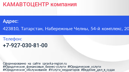 КАМАВТОЦЕНТР, компания по адресу 423810, Татарстан, Набережные Челны, 54-й комплекс, 20 в дальнейшем Организация, размещена в следующих категориях:
