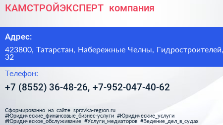 КАМСТРОЙЭКСПЕРТ+, компания по адресу 423800, Татарстан, Набережные Челны, Гидростроителей, 32 в дальнейшем Организация, размещена в следующих категориях: