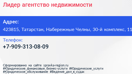 Лидер, агентство недвижимости по адресу 423815, Татарстан, Набережные Челны, 30-й комплекс, 11 в дальнейшем Организация, размещена в следующих категориях: