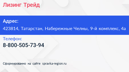Лизинг-Трейд по адресу 423814, Татарстан, Набережные Челны, 9-й комплекс, 4а в дальнейшем Организация, размещена в следующих категориях: