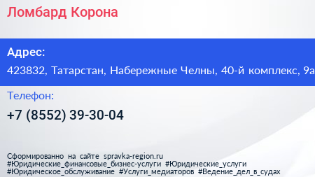 Ломбард Корона по адресу 423832, Татарстан, Набережные Челны, 40-й комплекс, 9а в дальнейшем Организация, размещена в следующих категориях: