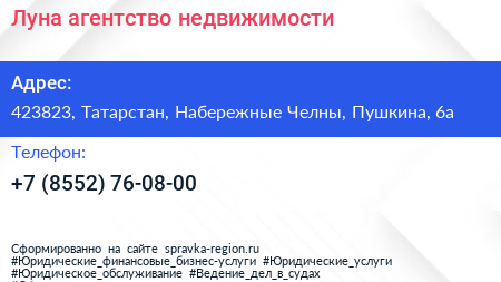 Луна, агентство недвижимости по адресу 423823, Татарстан, Набережные Челны, Пушкина, 6а в дальнейшем Организация, размещена в следующих категориях: