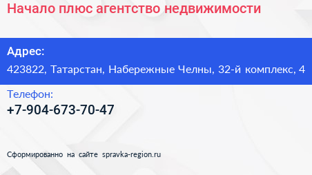 Начало плюс, агентство недвижимости по адресу 423822, Татарстан, Набережные Челны, 32-й комплекс, 4 в дальнейшем Организация, размещена в следующих категориях: