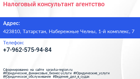 Налоговый консультант, агентство по адресу 423810, Татарстан, Набережные Челны, 1-й комплекс, 7 в дальнейшем Организация, размещена в следующих категориях: