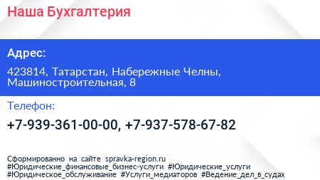 Наша Бухгалтерия по адресу 423814, Татарстан, Набережные Челны, Машиностроительная, 8 в дальнейшем Организация, размещена в следующих категориях: