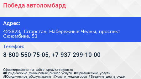 Победа, автоломбард по адресу 423823, Татарстан, Набережные Челны, проспект Сююмбике, 53 в дальнейшем Организация, размещена в следующих категориях: