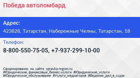 Победа, автоломбард по адресу 423828, Татарстан, Набережные Челны, Татарстан, 18 в дальнейшем Организация, размещена в следующих категориях: