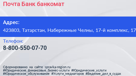 Почта Банк, банкомат по адресу 423803, Татарстан, Набережные Челны, 17-й комплекс, 17 в дальнейшем Организация, размещена в следующих категориях: