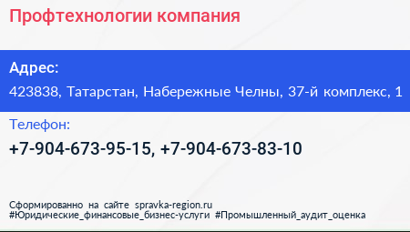 Профтехнологии, компания по адресу 423838, Татарстан, Набережные Челны, 37-й комплекс, 1 в дальнейшем Организация, размещена в следующих категориях: