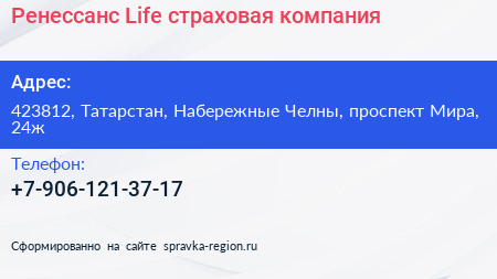Ренессанс Life, страховая компания по адресу 423812, Татарстан, Набережные Челны, проспект Мира, 24ж в дальнейшем Организация, размещена в следующих категориях: