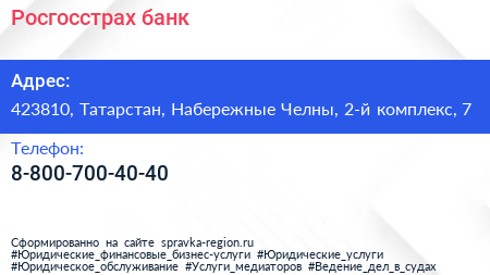 Росгосстрах банк по адресу 423810, Татарстан, Набережные Челны, 2-й комплекс, 7 в дальнейшем Организация, размещена в следующих категориях: