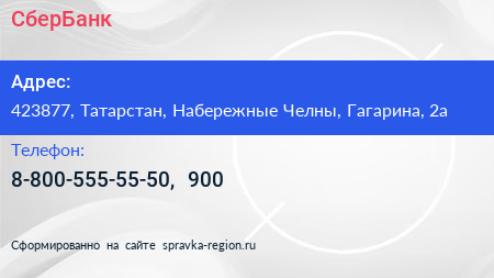 СберБанк по адресу 423877, Татарстан, Набережные Челны, Гагарина, 2а в дальнейшем Организация, размещена в следующих категориях: