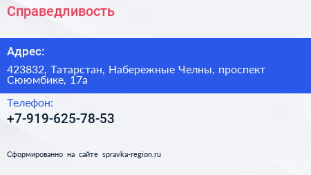 Справедливость по адресу 423832, Татарстан, Набережные Челны, проспект Сююмбике, 17а в дальнейшем Организация, размещена в следующих категориях: