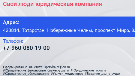 Свои люди, юридическая компания по адресу 423814, Татарстан, Набережные Челны, проспект Мира, 8а в дальнейшем Организация, размещена в следующих категориях: